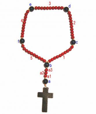 Ved de følgende fem led bestående af et (b, c, d, e, f) Fader vor ... og ti (1 -5) Hil dig, Maria….